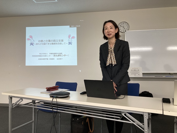 また、京都産業保健総合支援センター様を講師にお招きし、「治療と仕事の両立支援」に関する研修を実施いたしました。