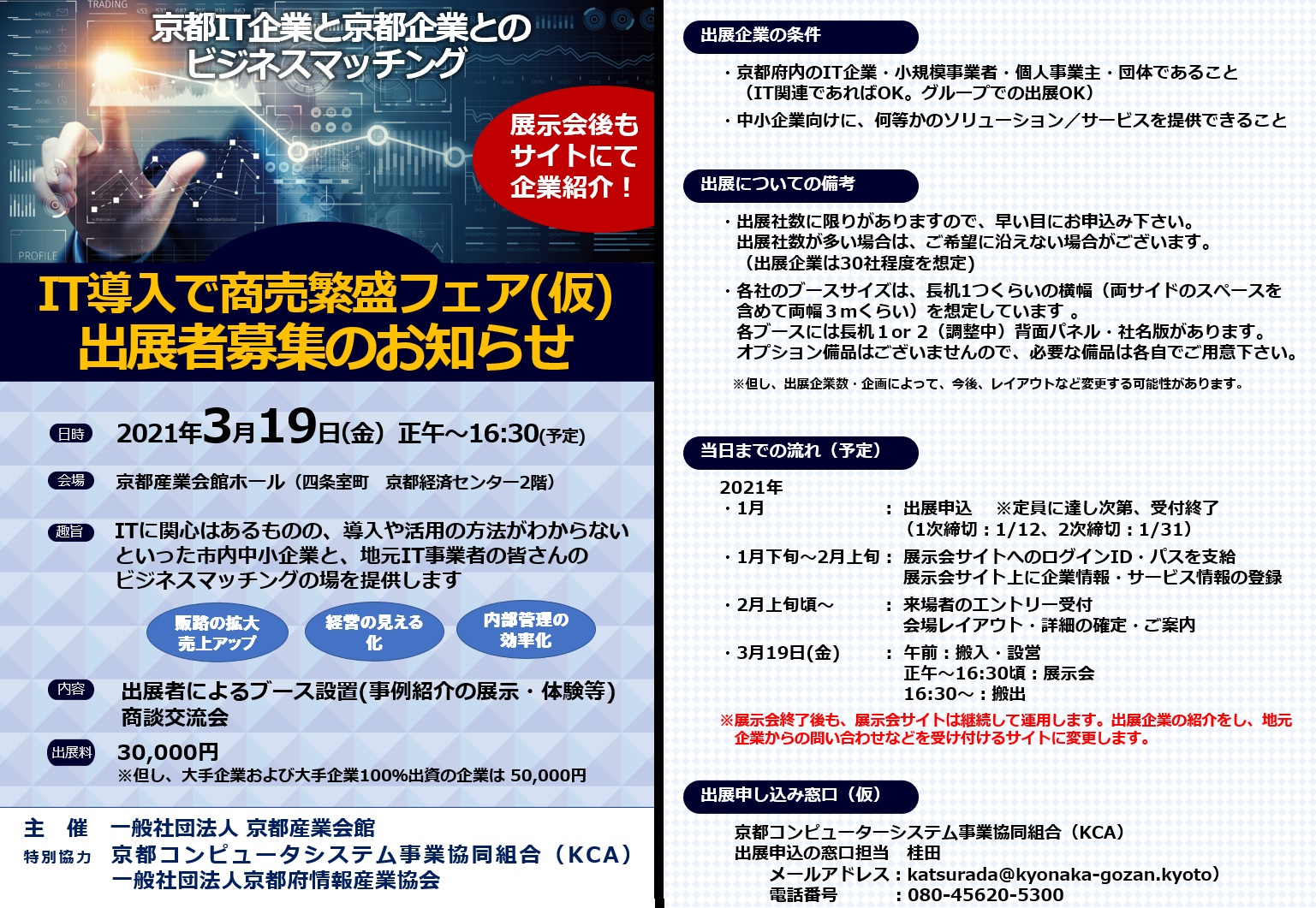 さて、この度、一般社団法人京都産業会館様が3/19(金)京都経済センター2階で主催される「IT導入で商売繁盛フェア(仮題)」に、KCA・京情協として全面協力することになりました。