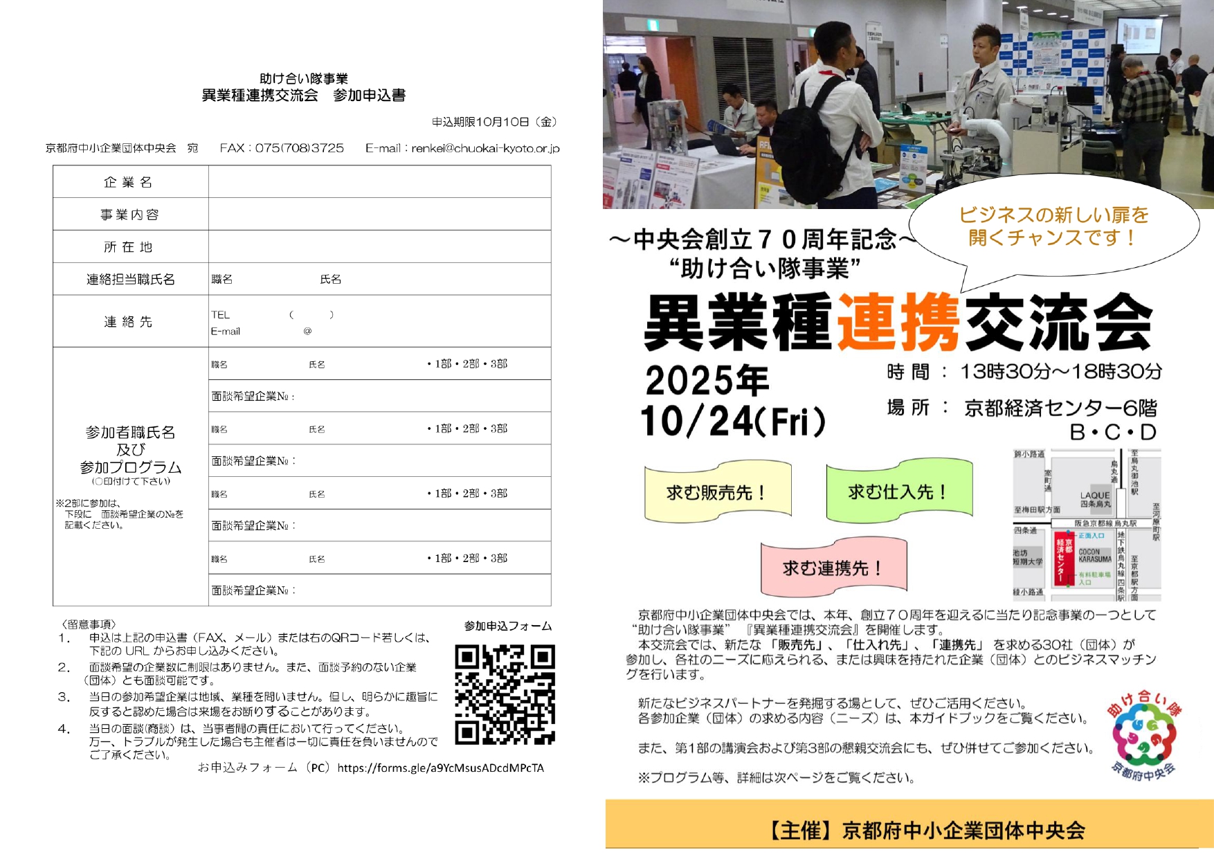 2025年10月24日(金)、京都府中小企業団体中央会様の創立70周年を記念した「異業種連携交流会」が、京都経済センターにて開催されます。
