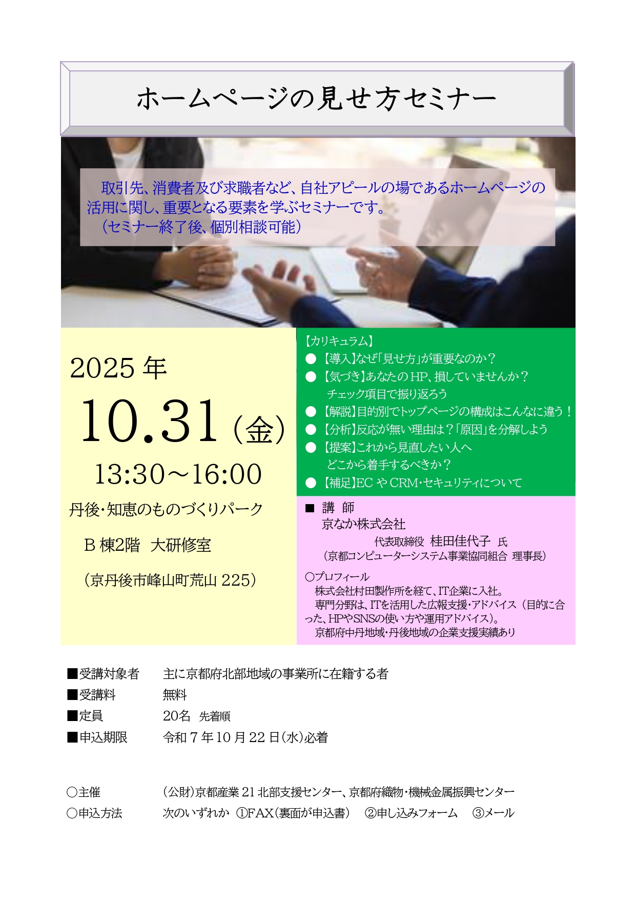 令和7年10月31日(金)、丹後・知恵のものづくりパークにて開催された「ホームページ活用セミナー」に理事長の桂田が講師として登壇いたしました。